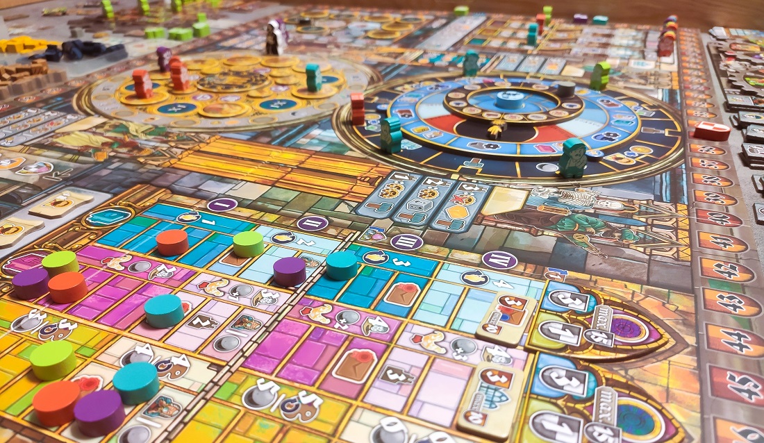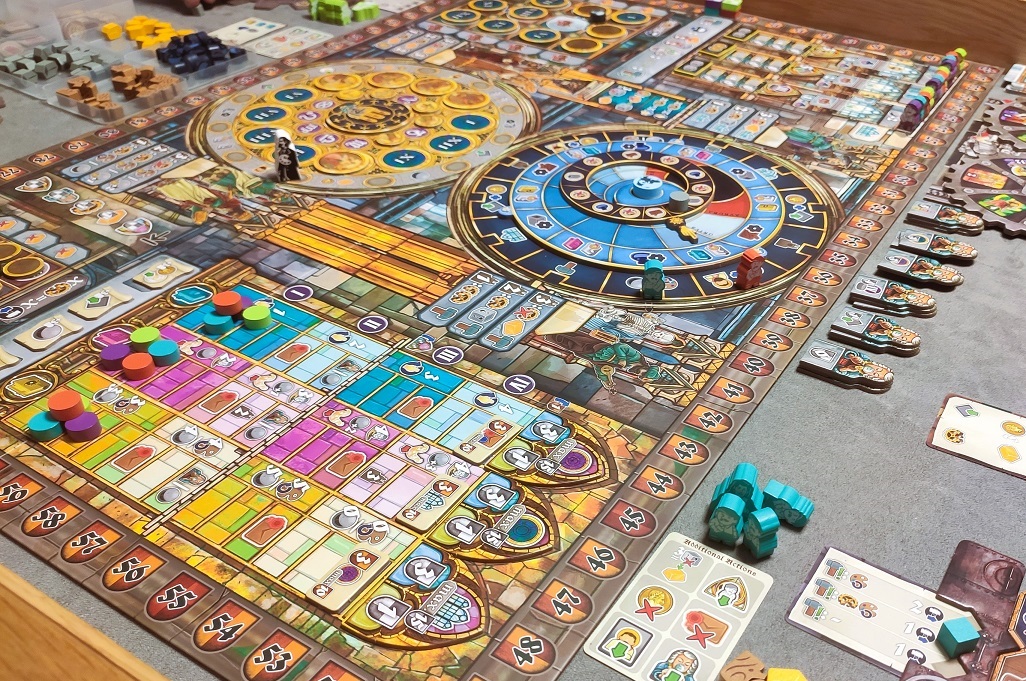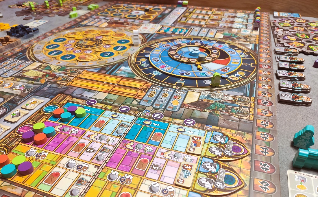 Ещё тут не перегруженная, а, наоборот, довольно увлекательная комбинаторика, над которой интересно подумать. Да, ещё понравился менеджмент рабочей силы, когда нужно следить за доступными миплами и вовремя высвобождать дополнительных, ведь часть из них оседает на жетонах знаков зодиака и на целях под витражами. Плюс, интересная задумка с поломкой шестерёнок для экстра прокруток и их починкой, игнорируя которую, можно словить штрафные очки.