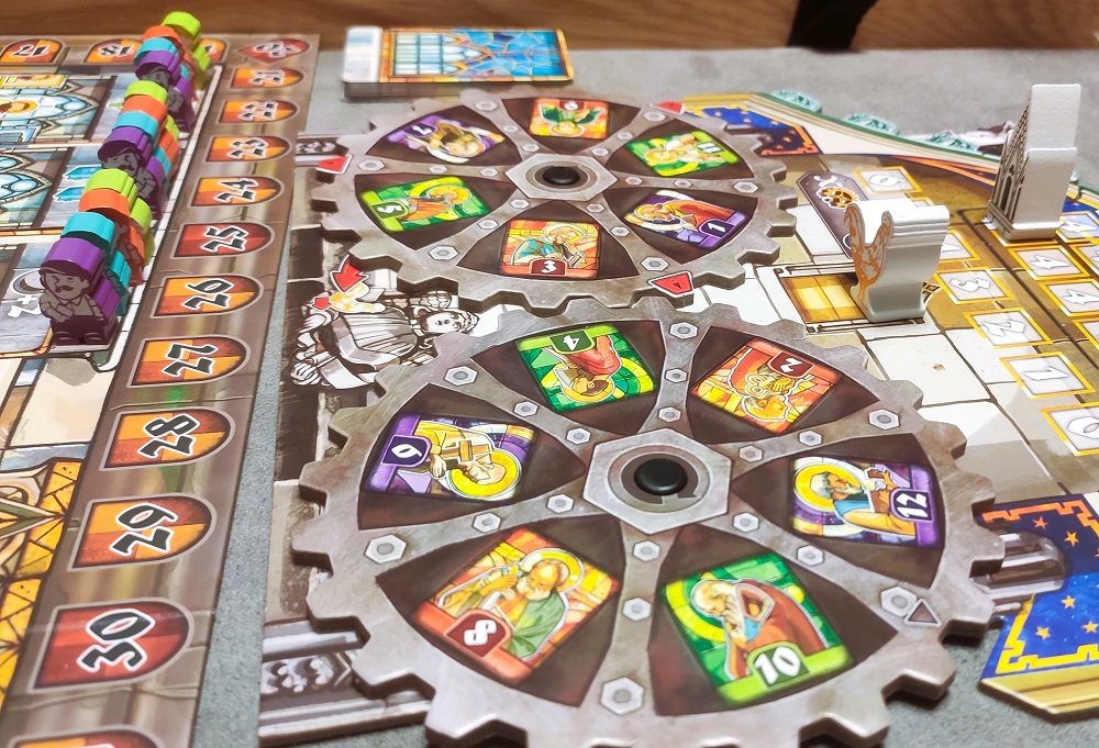 Символы действий на циферблате чаще всего соотносятся с определёнными зонами на игровом поле и вспомогательных планшетах. Ключевое действие, на котором зарабатывается много очков – это непосредственно строительство, оно обозначено выкладыванием малых и больших жетонов знаков зодиака. Ещё можно возводить так называемый карильон апостолов – брать жетоны апостолов со специального опять-таки крутящегося рынка и выкладывать их на свой планшет ради бонусов и тех же самых очков. А ещё здесь есть витражи – на их карточки привлекаются помощники с бонусными ПО на конец игры.