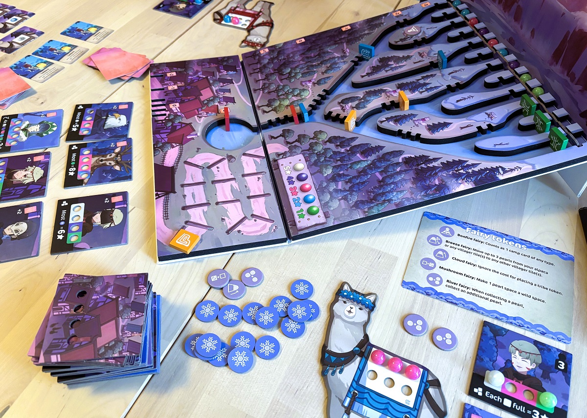 Подготовка не требует никаких танцев с бубнами – для того, чтобы реки забурлили, достаточно просто расправить поле и закрепить его двумя картонными ножками. Арсенал же каждого игрока состоит из 3 перегородок, 5 случайных карточек, грузовой альпаки и стартового персонажа.