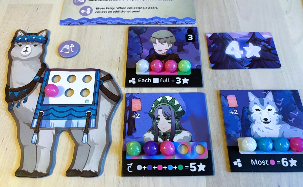 Нужно постоянно заботиться о притоке карт и следить за тем, чтобы было куда сгружать шарики. Ну, и свойства персонажей должны себя как-то оправдывать, брать кого попало так себе затея. Что касается сбора цветных жемчужин, то мысль ясна: хочешь конкретные цвета – плати больше или хитри с помощью карт и жетончиков фей. Если нужных цветов на раунд выпало достаточно, то вроде можно и не переплачивать, но тогда придётся держать в уме то, что соперники тоже могут сыграть карты и, допустим, умыкнуть сразу две жемчужины. То есть, к такого рода подрезалову нужно быть готовым, а для этого неплохо бы следить за тем, какие карточки берут на рынке оппоненты.