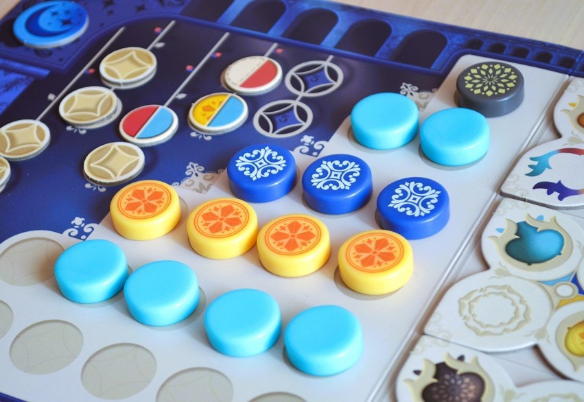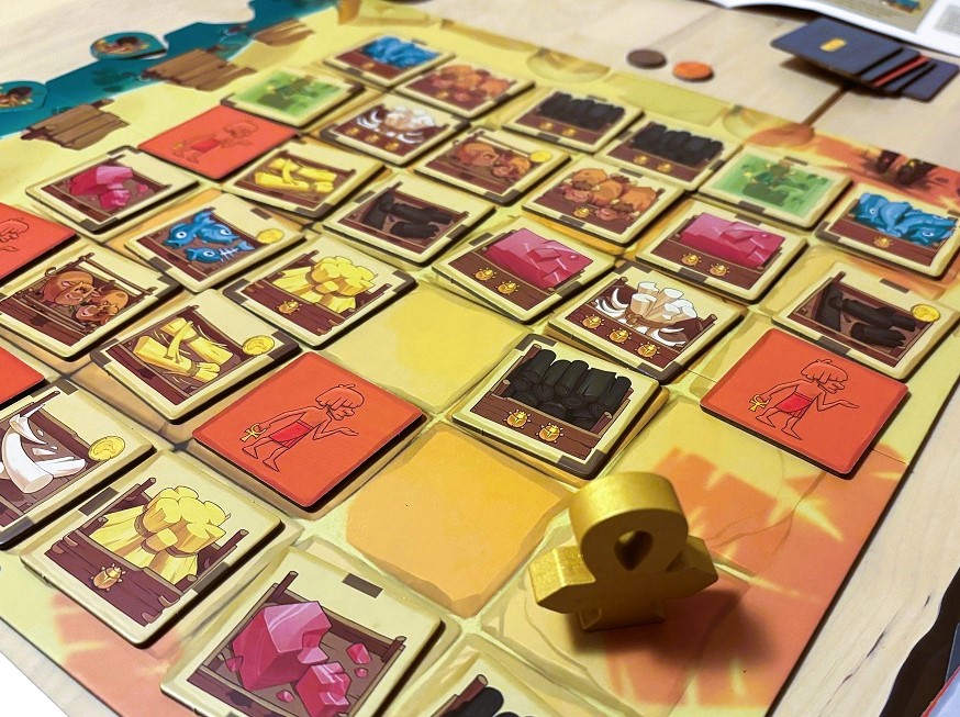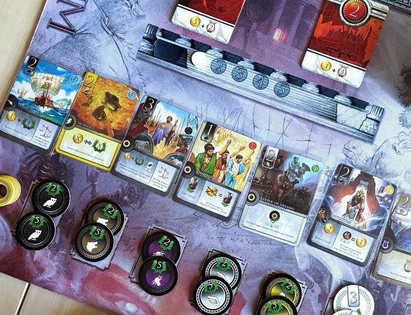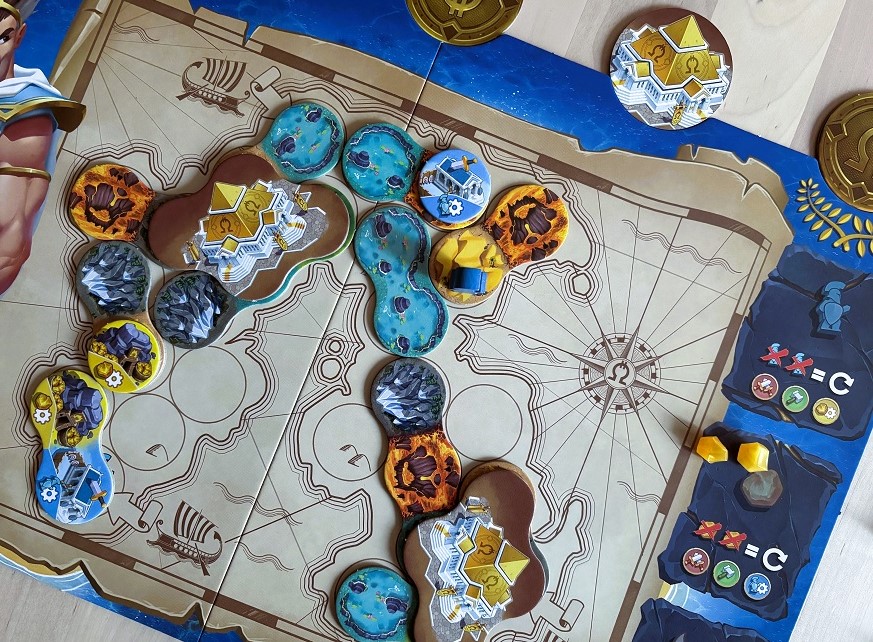 Orichalcum. Из той же посылки, что и Tokaido. Довольно жёсткая гонка до 5 очков, которые можно заработать, наладив производство ресурсов и правильно скомпоновав тайлы местности под города и титанов. Всё перечисленное реализуется посредством выбора связок “карта с действием + тайл местности”. Сыграли трижды, и на данный момент трудно сказать, будем ли ещё, всё же целевая аудитория тут загадочная: процесс супер-конкурентный и по правилам не очень-то и простой, а выглядит, как нечто совсем детское.