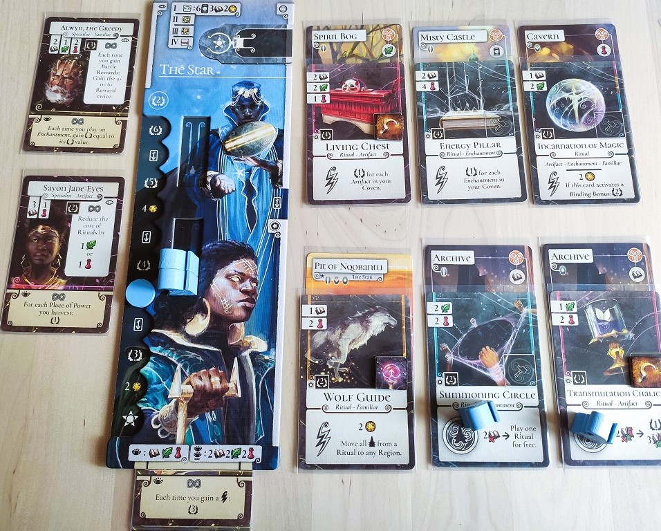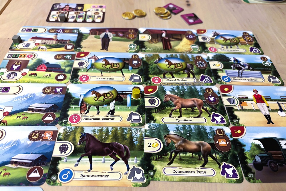 Epona. Новинка от Сухи, тоже одна партия и … это что-то совсем как-то лениво и замудрено. Подробнее напишу в отчёте, но, если кратко: берём карты из разных колод (присутствует некий вайб Last Will) и выкладываем их в ряды, дабы удовлетворить требования конюшен, закомбить значки и получить побольше ПО. Тонна различных символов, за которыми трудно уследить, скучный драфт и, в целом, ничего нового и необычного. Ну, кроме темы разведения лошадок. Не знаю, хочу ли я давать ей второй шанс.