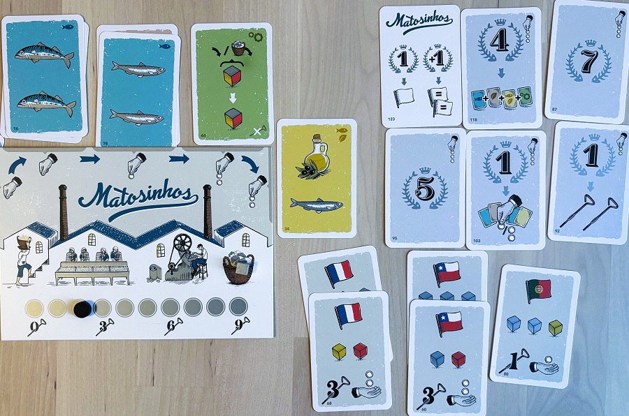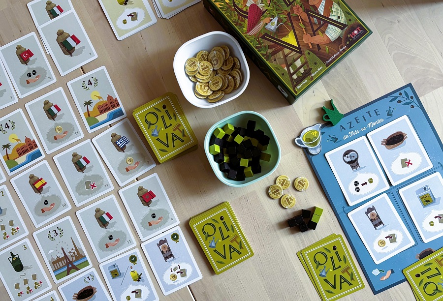 Oliva. Буквально перед выставкой зацепил пару восторженных отзывов, и рискнул взять. Хотя до этого об этом португальском издательстве толком ничего и не слышал. Потом уже оказалось, что Oliva – их третья игра из запланированной компактной пятикоробочной серии (первая – Кофе, вторая – Рыбы). В своё время как-то наелся колодостроем, но Оливка аккуратно и безболезненно вернула в этот жанр, предложив ощущение действительно большой игры через колоду карт, горстку жетонов и ряд занятных нюансов.