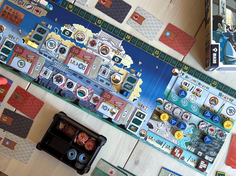 Tokaido. Здесь меня занесло на французский philibert, взял на скидках. Думал, сыну зайдёт, но после пары партий интерес перестал проявлять. Я же поймал себя на мысли, что игра, несмотря на медитативный внешний вид и тему увлекательного путешествия, на деле одновременно и злая, и скучненькая. Скорее всего, пойдёт на продажу.