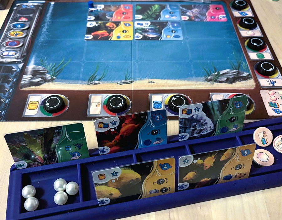 Aquaria. Вот неплохая вроде игра от набирающего вес и популярность Томаша Холека, но есть ощущение, что моментами не докрутили. Может, это у меня с его играми так, вон, S.E.T.I. тоже по механикам прям моё, а на деле чего-то не хватило. В случае с Aquaria ещё и оформлено всё дёшево и страшненько. Не помогли даже китайские жемчужины. Но 5 партий отыграли, и реально было неплохо, да и все, с кем садился, тоже приятно отозвались. Ей бы косметический ремонт и больше модульности, тогда бы и не продавал.