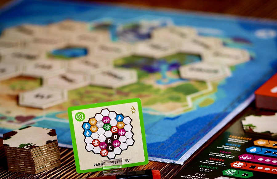 Landmarks. Игрушка на ассоциации, где ведущему нужно провести сокомандников через опасный остров посредством ассоциаций. Есть 3 стартовых гекса-слова, от которых следует плясать. Ведущий придумывает слово, записывает на тайле и отдаёт товарищам. Тем, в свою очередь, нужно догадаться, куда его следует пристроить. И самый кайф, конечно, это давать подсказки, в которых умело “скрещены” сразу несколько смежных участков-слов. На острове есть ловушки, сокращающие запас тайлов, проклятья и заветные сокровища, без которых победить не получится. Оригинально, в меру мозголомно и отлично идёт вдвоём.