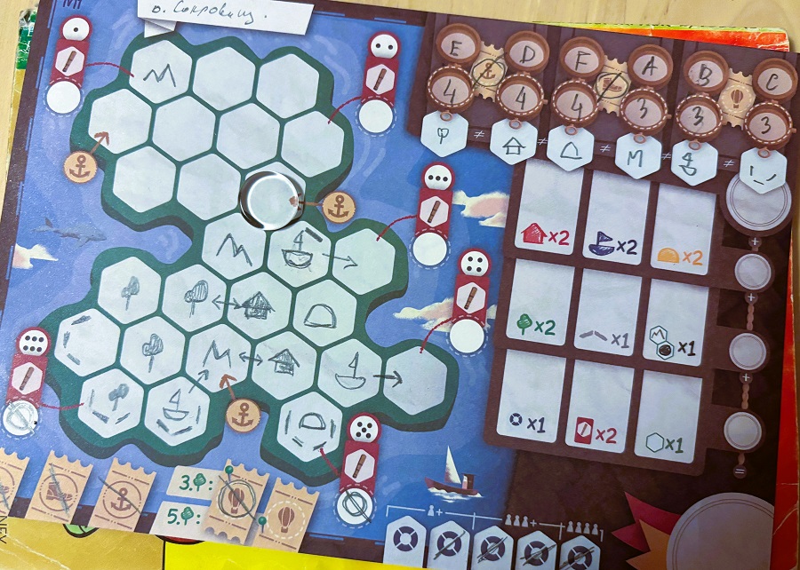 Peninsula. Небольшой roll & write, который взял в довесок к Clans of Caledonia: Industria. Вернее, это flip & write. Пока сыграли единожды – ничего революционного, но изюминка имеется. Там, чтобы зарисовывать гексы, необходимо постоянно продвигать так называемого архитектора – прозрачный диск. И вот планировать эти очки движения та ещё задачка. А так, всё стандартно: закрашиваем участки различными символами согласно скорингу и попутно выполняем цели. Пока полежит.