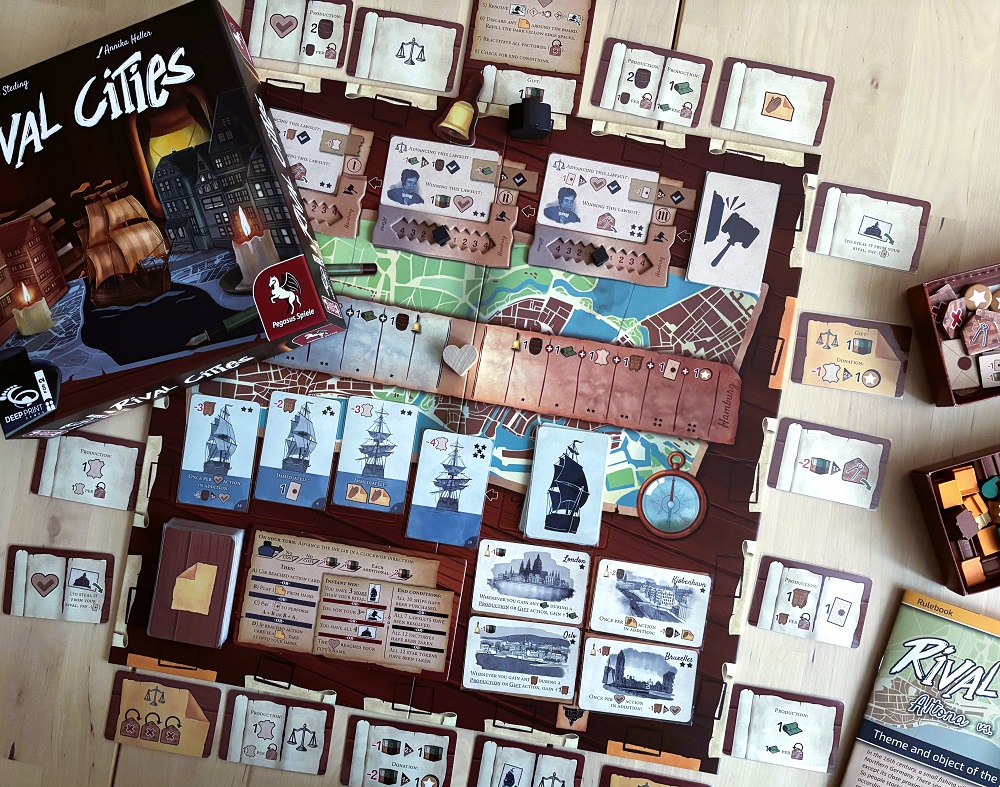Rival Cities. Тоже одна партия. Более евровый Watergate от автора Hansa Teutonica с действиями на большом общем ронделе. И тоже дуэль. Четыре варианта мгновенной победы, поэтому следить за успеха оппонента и всё просчитывать придётся ну очень тщательно. Выглядит приятно, особенно крупные фигурные ресурсы, плюс, всё помещается в 4 небольших лотка, а те – в компактную коробку формата Beer & Bread (издатель тот же). После одной партии трудно что-то сказать, но желание изучать дальше имеется, любителям жанра перетягивания каната стоит обратить внимание.