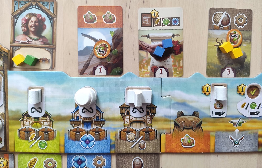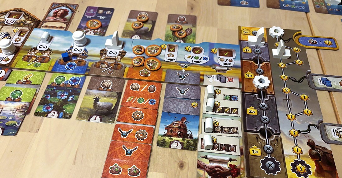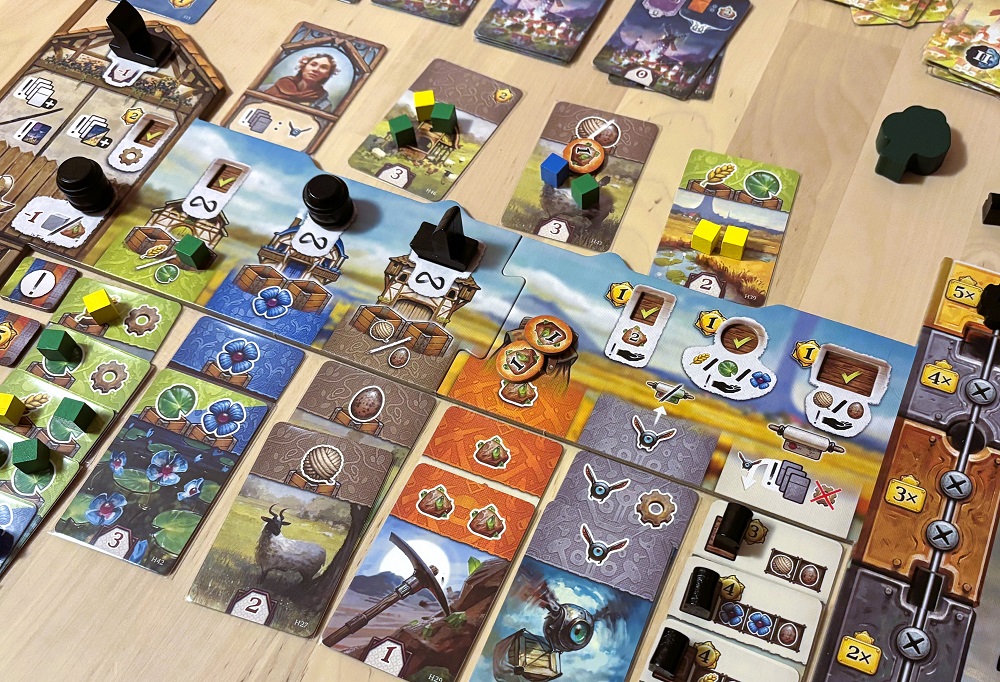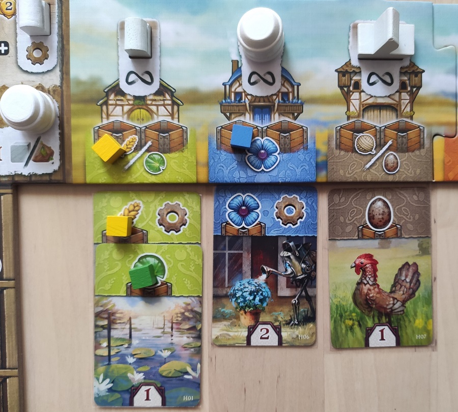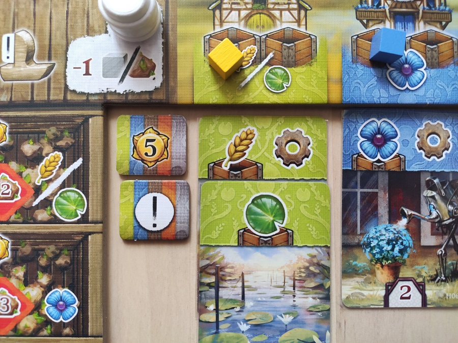 После покупки карта кладётся к соответствующему цвету, что запускает активацию всех эффектов в этой колонке. Первые три колонки отвечают за производство ранее упомянутых товаров: зерна, кувшинок, цветов, яиц и шерсти. Четвёртая – это сборная солянка из других колонок и получение энергии. Пятая запускает доставки с помощью дронов и часто двигает шестерёнки на треке технологий, где можно получить жетоны с постоянным свойством или на дополнительные очки. И, наконец, шестая колонка – это личные заказы, которые тоже активируют доставку.