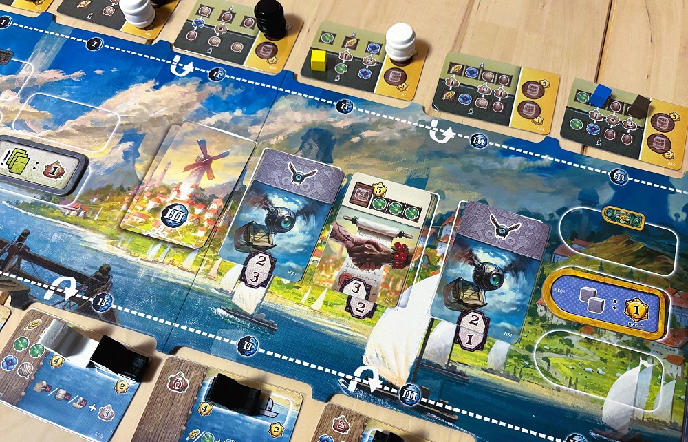 В свой ход есть всего лишь 2 опции: купить карточку и пристроить её в соответствующую колонку своей фермы или же выполнить морской заказ. С последним всё понятно – просто сдаём требуемый набор товаров и выставляем на карту заказа кораблик. Но самое важное и интересное – это первый вариант. Тут закралось сразу несколько любопытных идей, которые делают игру привлекательной и механически, и именно в дуэльном плане.