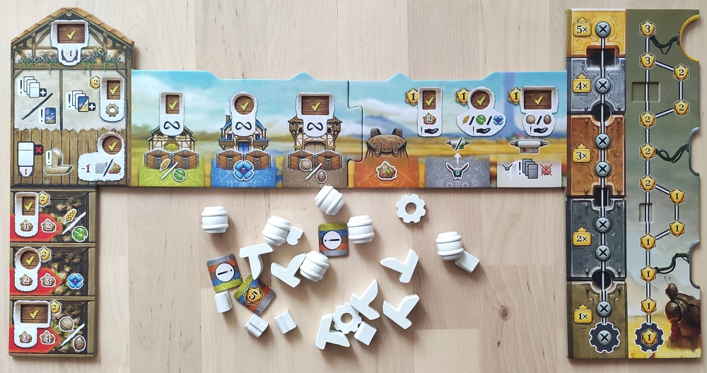 Что понравилось? Понятное дело, идея с активацией карт. Такое я полюбил ещё, когда плотно играл в Deus. Причём, тут валидны обе стратегии: можно налегать на одну-две ресурсные колонки и чаще собирать большой урожай, а можно распыляться на ряды, что даёт гибкость, принесёт бонусные жетоны и потенциально дополнительные активации.