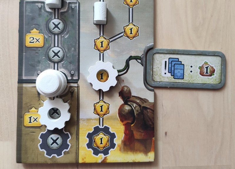 В правой части планшета расположились бонусы на скидки и более выгодные конвертации ресурсов, посередине – улучшенные хранилища и доход, а слева фишки необходимо снимать, дабы продвигать маркеры шестерёнок по двум трекам технологий.