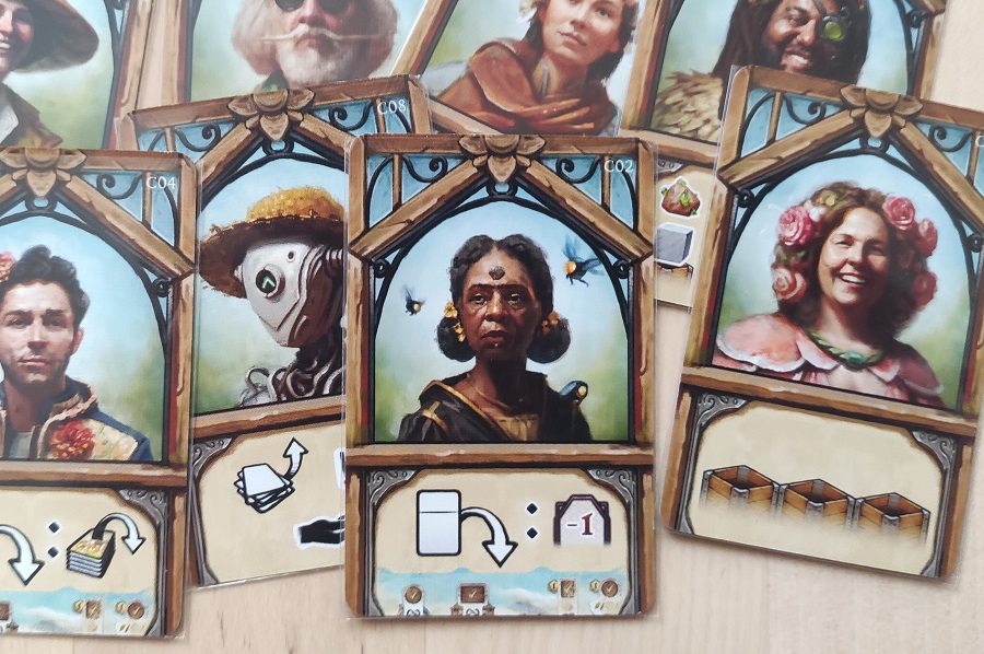 В начале партии каждому достаётся по ресурсу каждого типа и три карточки, которые выкладываются над планшетом. Последний штрих – из двух случайных персонажей с уникальными свойствами нужно выбрать одного.