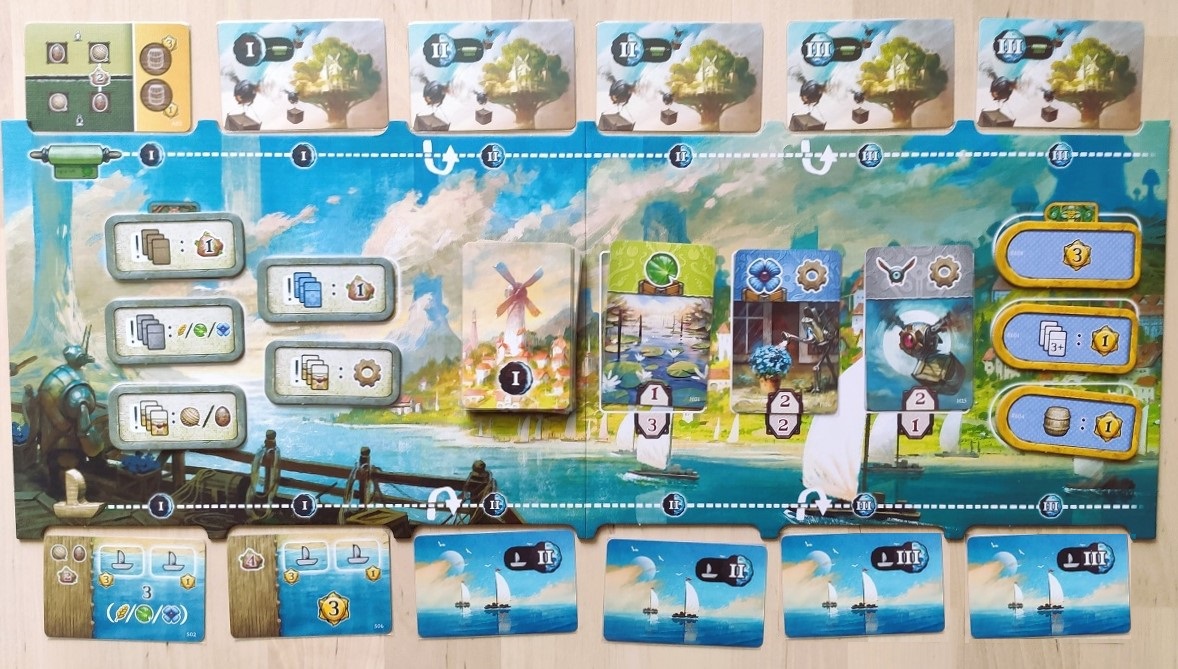 Кроме личных планшетов нужно ещё подготовить рынок карт фермы и сами заказы. Всё это сортируется по трём эпохам и раскладывается рядом со вспомогательным полем. В центре расположился общий рынок карт и жетоны улучшений, а два типа заказов, наземные и морские, кладутся над и под полем, соответственно.