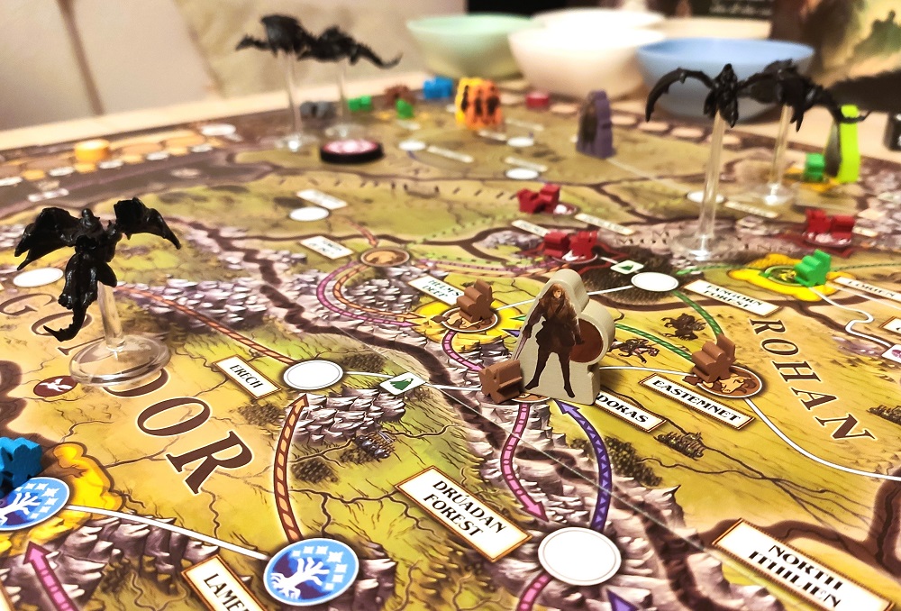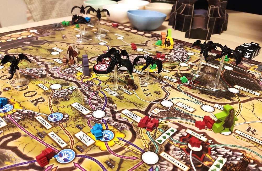 Видоизменённый механизм Пандемии неплохо и довольно тематично моделирует поведение врагов: Назгулы шныряют туда-сюда, армии копят силы, а потом стремительно продвигаются к целям. Этакий навороченный Андор.