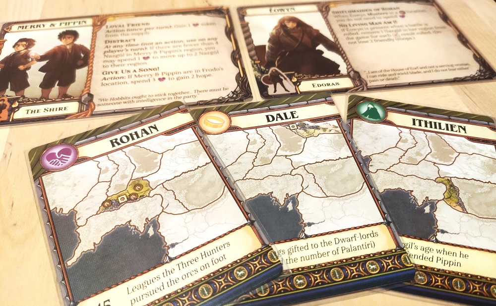 Враги тут двигаются по предначертанным маршрутам и пытаются захватить определённые локации, снижая тем самым параметр надежды. Если он спустится до нуля, герои проигрывают. Как вы уже поняли, за положением дел на поле придётся следить очень внимательно, а ситуация может поменяться кардинально в один миг. Те же Назгулы постоянно кружат в небе, стараясь вычислить местоположение Фродо и Сэма, которым не стоит долго задерживаться в одном регионе, ибо при неудачной проверке надежда снова померкнет.