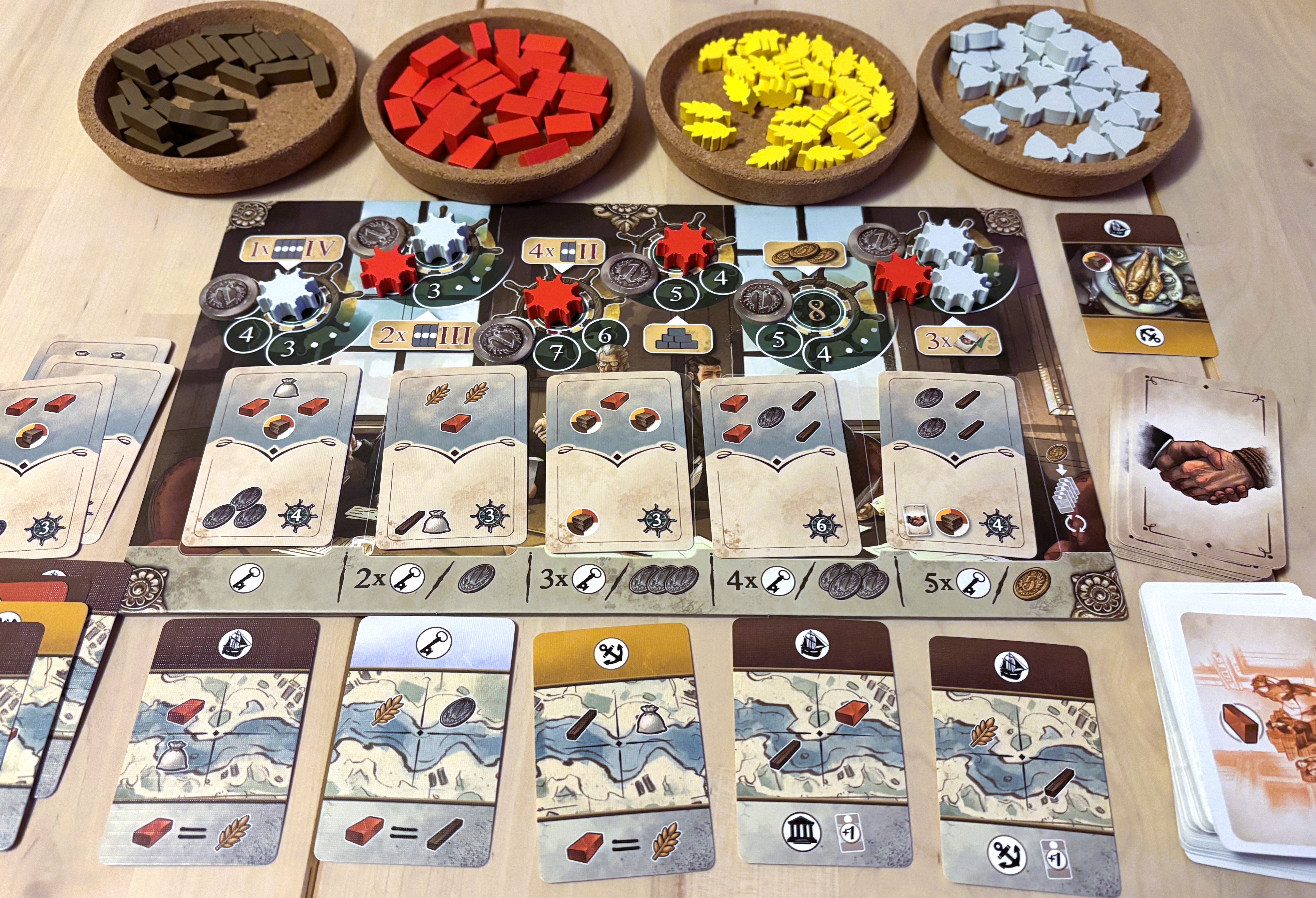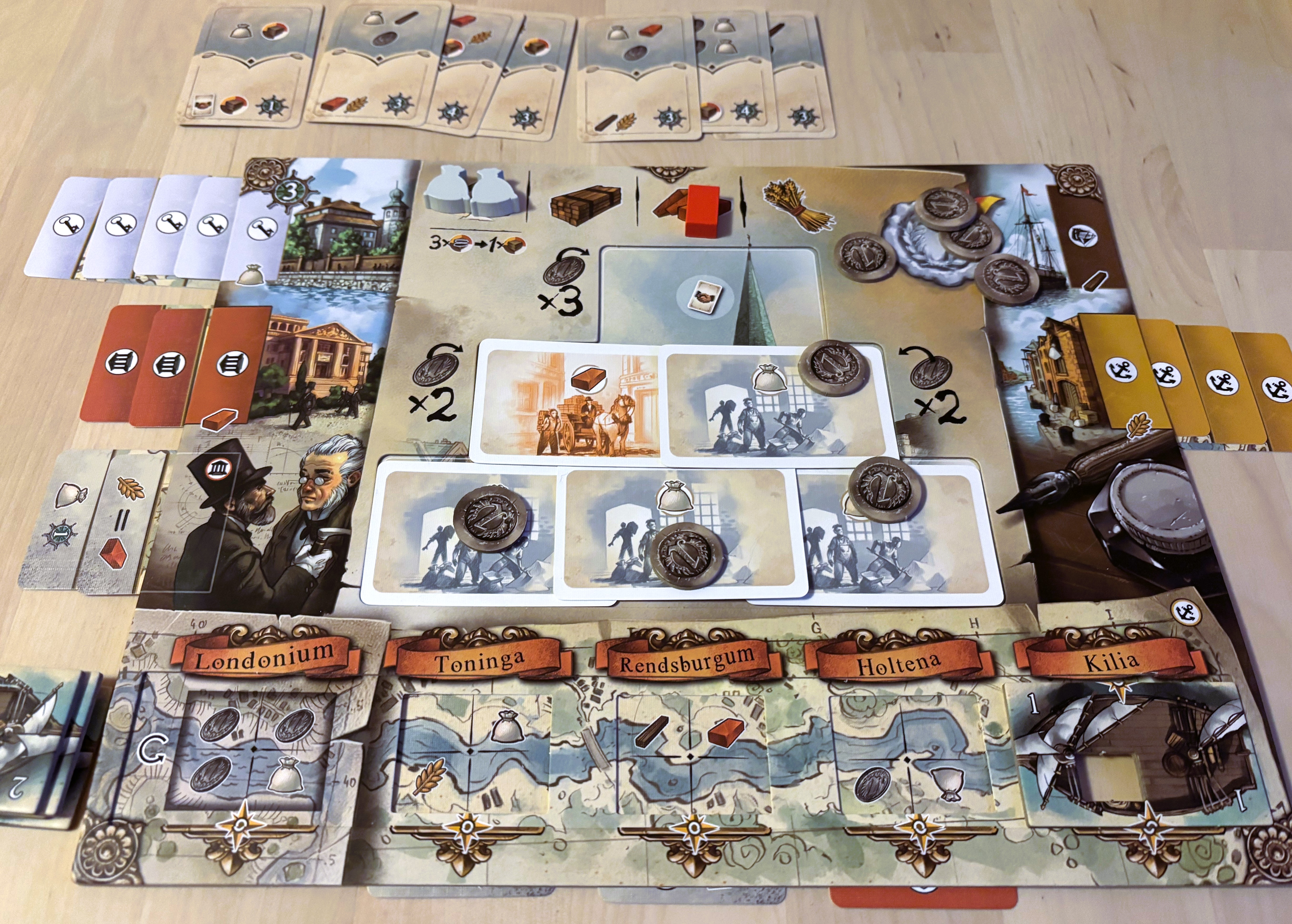Каждому достаётся планшет, обозначающий непосредственно канал и городскую торговую площадь с четырьмя зонами для улучшений. В центре стола располагается вспомогательное поле, на котором отмечены общие цели, и есть место под два ряда карт: действия и контракты.