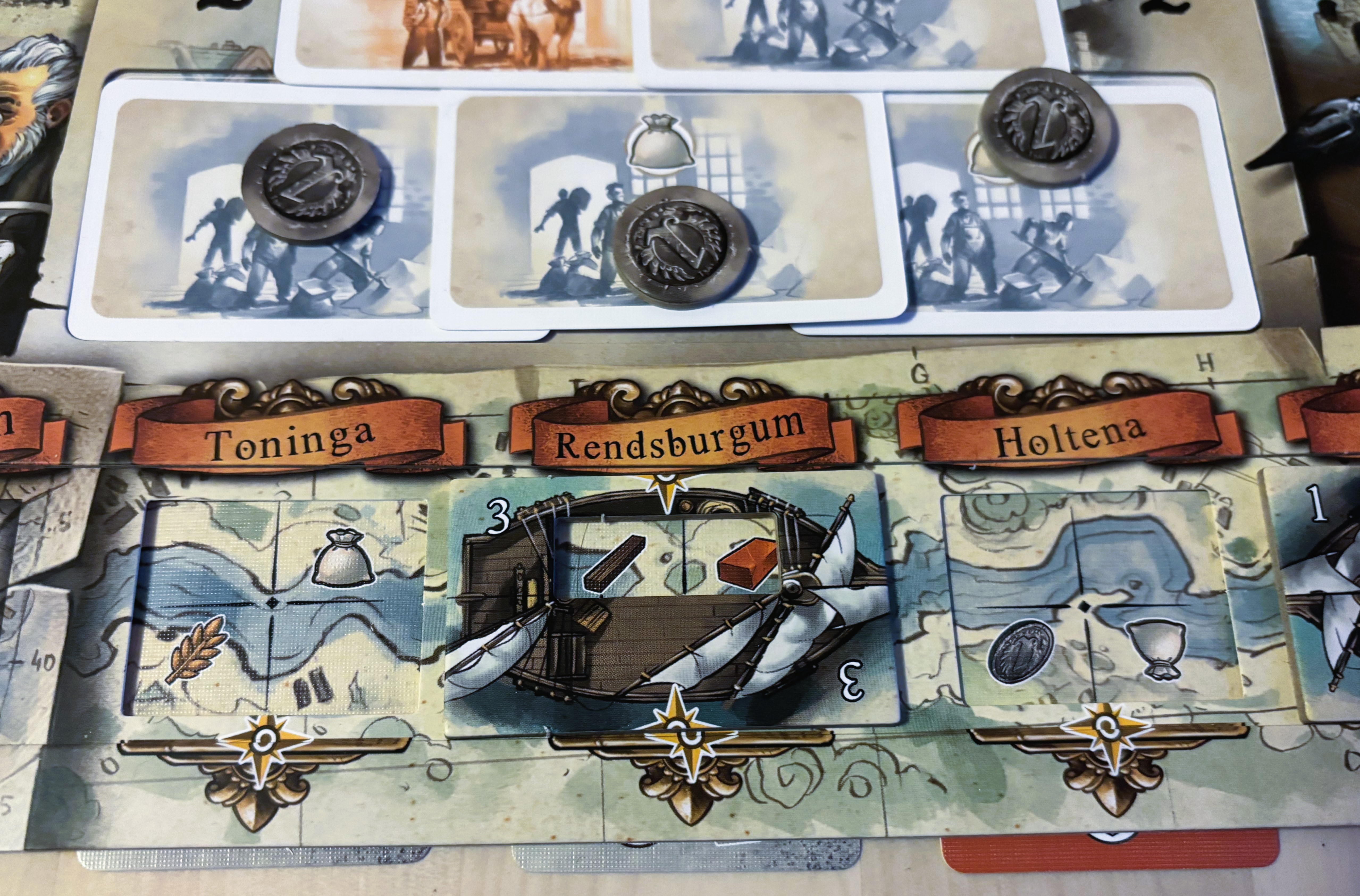 В конце каждого раунда, т.е. когда все сделают по ходу, корабли игроков плывут по каналу и на каждой остановке собирают ресурсы, которые видны в окошке. На стартовом кораблике прорезана всего одна ячейка, но если прокачать верфь максимально, то будет видна локация целиком. В конце пути корабли переворачиваются, и это означает, что в следующем раунде они поплывут в обратном направлении.