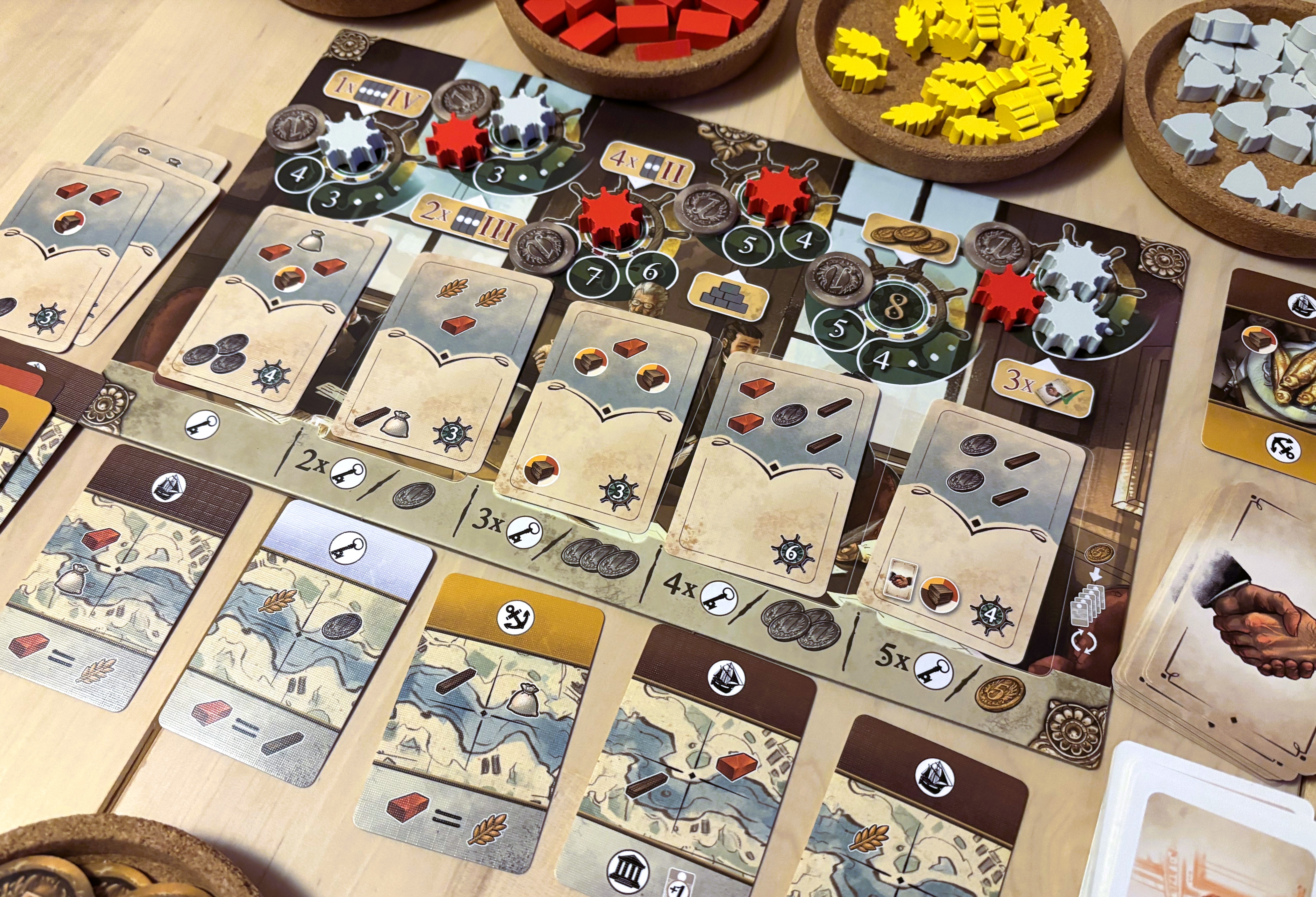 Сама возня с карточками напоминает La Granja, но тут всё гораздо проще и прямолинейней, в хорошем смысле этого слова. Ходы быстрые, ресурсы не задерживаются, ибо перед нами гонка за контрактами и целями. Разумеется, в начале партии может ощущаться рандом в приходе определённых действий/улучшений, но в этом случае ход можно потратить на то, чтобы прокачать сеть торговцев. А они тут очень полезны, так как позволяют не только докупать недостающие ресурсы, но и при закладывании пирамиды приносят бонусы в виде ресурсов, контрактов и одноразовой спец-карты со шпротами, которая, к слову, тоже призвана снизить рандом, ведь её можно применить, как любой тип улучшения.