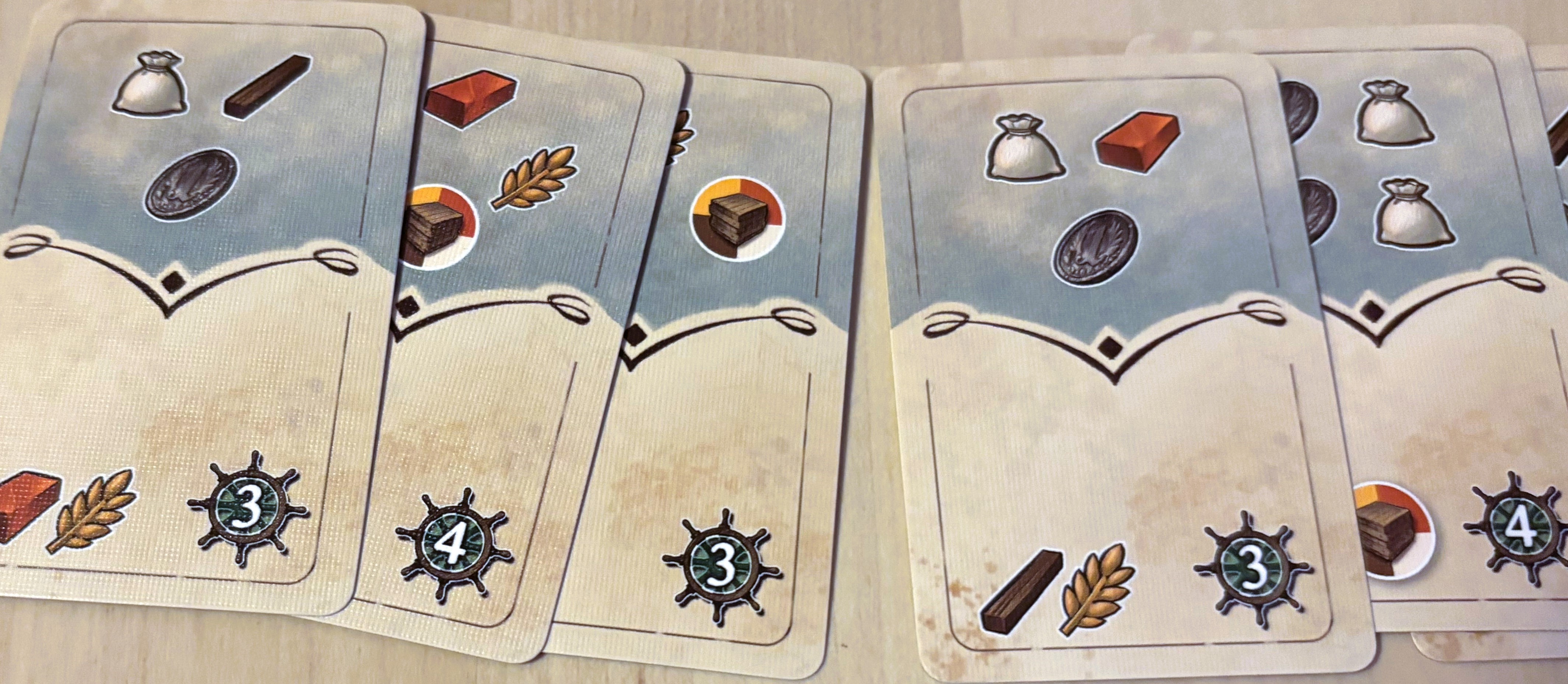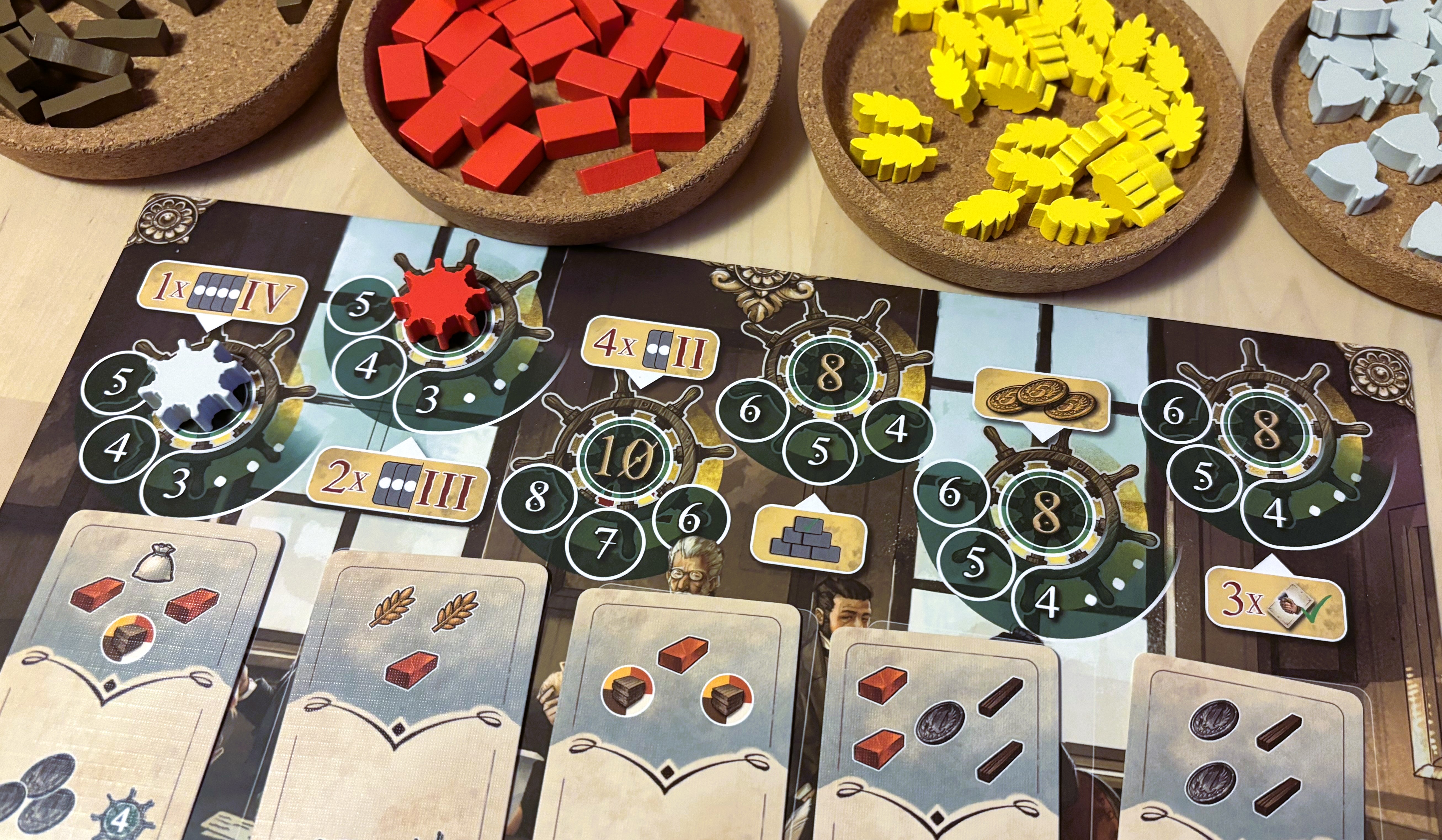 Что касается улучшений, то их 4 типа, и каждую из зон можно прокачать максимум 4 раза. Белые карточки (замок) позволяют брать контракты и увеличивают запас ключей, чем расширяют выбор бесплатных карт действий на рынке. За красные (университет) можно сразу же взять другую карту и подсунуть её в качестве полезной способности: обмен одного ресурса на другой, дополнительные действия, очки за оставшиеся ресурсы. Коричневые карты (верфь) прокачивают тайлы кораблей, которые в конце раунда плывут по каналу и через прорезанные окошки собирают ресурсы. И, наконец, жёлтые (склады) дают возможность подсунуть карту в зону канала, что увеличивает число остановок для корабля.
