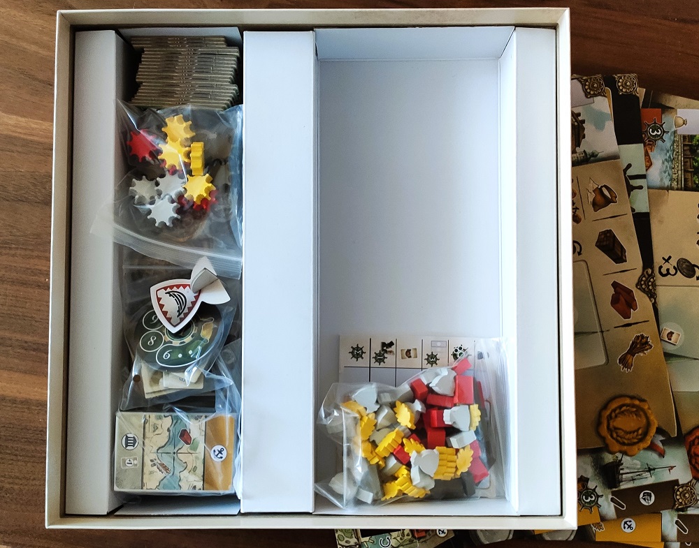 И последний недочёт – отсутствие памяток, хотя бы на обратной стороне правил сделали. Не говоря уже о том, что рядом с каждой зоной для улучшения не хватает иконографики. Разве так тяжело было в зоне с ключиком нарисовать “+контракт”, а в зонах с верфью и складом “+карта” с указанием, какой стороной её надо подсунуть. И ведь опытный издатель вроде.