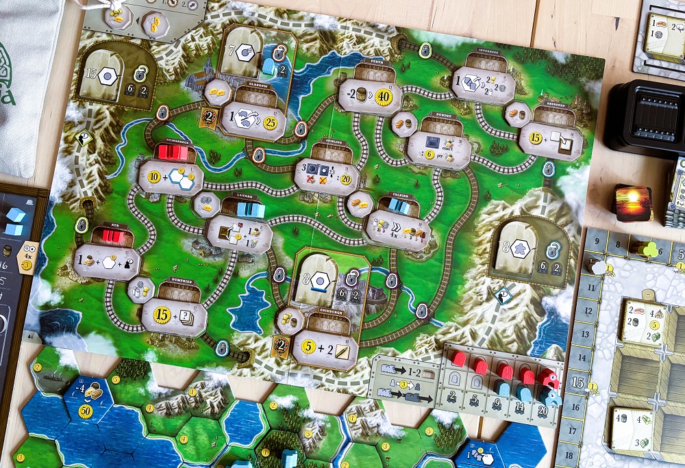 Ну, и, наконец, самое существенное нововведение – это поле железной дороги с сопутствующими компонентами в виде фишек поездов, тайлов достижений, жетонов спроса и доставки.