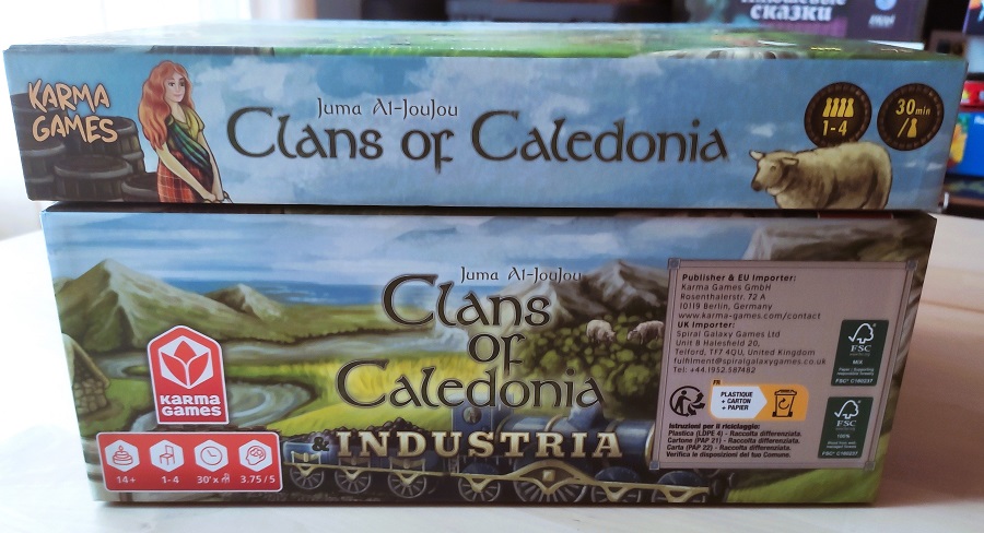 Clans of Caledonia: Industria. Пока одна ознакомительная партия со всеми модулями, но могу сказать, что для фанатов игры это must have. Во-первых, по части дополнительных кланов, бонусов портов, бонусов на раунд, кусков поля и прочего количество нового контента тут сравнимо с базовой игрой.