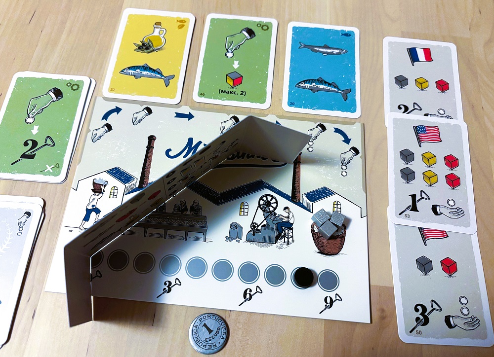 Следовательно, во всех этих моментах тебя могут подрезать: оставить бесполезные карты, заполнить в контрактах нужные ячейки, умыкнуть желаемую цель. Но именно этим игра и зацепила. Хочешь вкусные карты – ставь больше действий. Ну, а если будешь жадничать и не рисковать, то есть шанс загубить партию. Например, в последней у меня так и получилось, когда я дважды сглупил и не решился повысить ставку. В итоге производственная цепочка осталась без кильки в томате, из-за чего соперник “добивал” контракты с красными кубиками в одиночку.