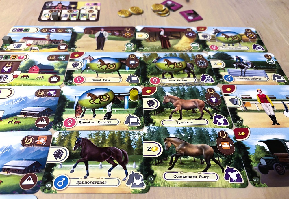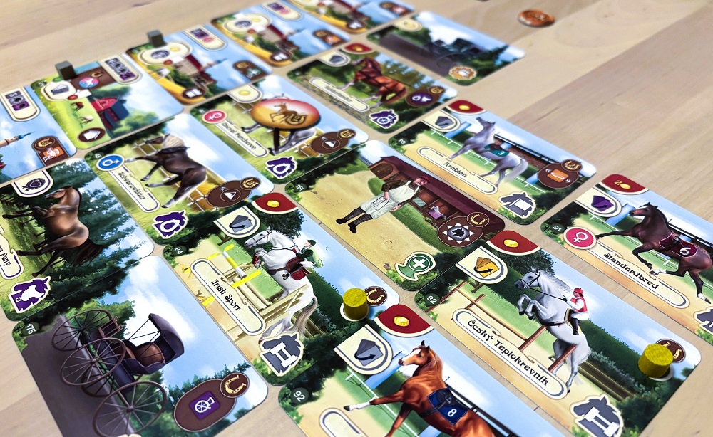 Epona. Игра на эффективную комбинаторику: берём карты из разных колод и выкладываем их в ряды, дабы удовлетворить требования конюшен, соседних карточек и т.д.