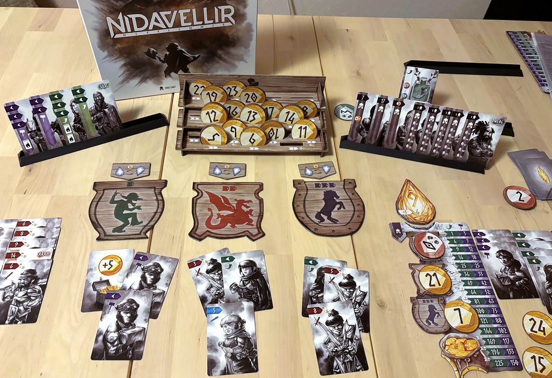 Nidavellir. Пару партий на двоих и троих. Ну, классная игра же, жаль, что раньше не попробовал. Да, сбор сетов а-ля 7 Wonders идея не новая, но тут всё дело в элегантном азартном аукционе-драфте и прокачке монет, с помощью которых делаются ставки.