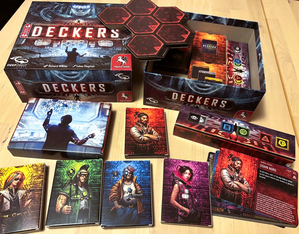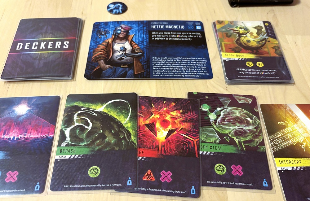 Deckers. Одна пробная партия на троих. Кооператив с колодостроем на тему хакерства, серверов и искусственного интеллекта, захватившего мир. На деле же выбираем сценарий, отличающийся набором последовательных целей, и за счёт слаженных действий и умелого применения свойств карточек и способностей персонажей стараемся эти цели выполнить.