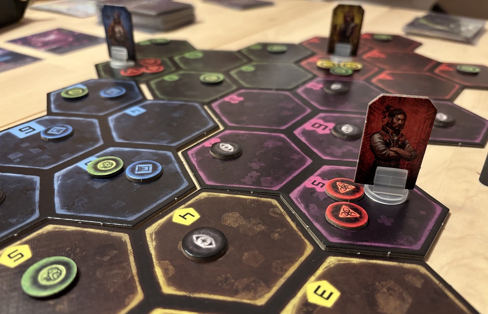 Как видно, игра не слишком тематичная, особенно, если вы далеки от сеттинга. По сути, ходим по гексам, создаём цветные кругляши и квадраты, двигаем их и сдерживаем натиск вражеских серых жетонов. Из интересных моментов – прокачка колоды. Карты покупаются за те же символы, и новая сразу же идёт в руку, заменяя одну из тех, которая участвовала в покупке.