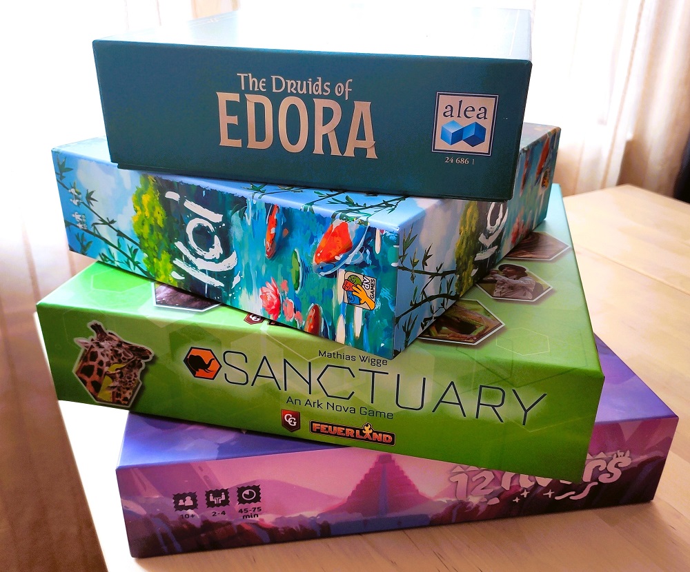 С удовольствием показал заинтересовавшие его игры, по итогу успели сыграть во всё запланированное и потом ещё шлифанули быстрыми Light Speed Arena и Hitster. В качестве же основных блюд были: Druids of Edora, Sanctuary, Koi и 12 Rivers. Алексей, думаю, сам поделиться впечатлениями в своём блоге, но, как мне показалось, больше всего ему зашли Друиды. Мне они, к слову, тоже всё больше нравятся, и превозмоганием трудностей с едой, и разнообразием стратегий, и адекватным временем партии.