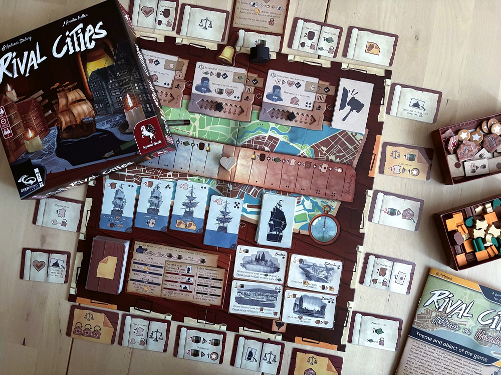 Rival Cities. Две партии, но какие-то совсем сумбурные. Очень много факторов, за которыми нужно следить: и четыре варианта мгновенной победы, и огромный рондель с карточками-действиями, и соперник, в конце концов. По итогу в какой-то момент партия внезапно обрывалась по причине детского просчёта. В общем, тут явно нужен серьёзный наигрыш.
