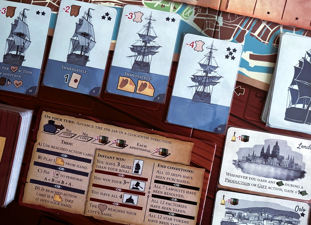Что касается самого процесса, то оба игрока по очереди переставляют фишку чернильницы (первые два шага бесплатно, следующие два за ресурс, а потом за два ресурса), после чего выбирают одну из опций: либо выполнить действие с карты, рядом с которой остановилась фишка; либо сыграть специальную жёлтую карту с руки (там действия круче); либо провернуть оба варианта, скинув ценный жетон конверта; или же, если чернильница находится рядом с жёлтой спец-картой, просто взять её в руку.