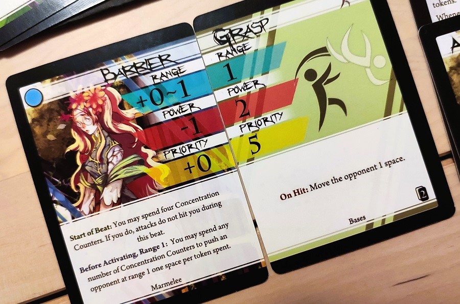 Раунды проходят следующим образом: игроки тайно комбинируют по две карты так, чтобы те складывались в три показателя: дальность атаки, сила и инициатива (приоритет). Потом пары вскрываются, и первым ходит тот, у кого инициатива выше. Если атака оказалась успешной, и соперник не смог выставить блок на оглушение, то он свой ход теряет. Так происходит до тех пор, пока один не прикончит другого, то есть, не снизит запас жизней до нуля, или же не закончится отведённое время (15 раундов, кажется). Ещё один немаловажный момент: карты, которые использовались в текущем раунде, вернутся в руку только через два хода.