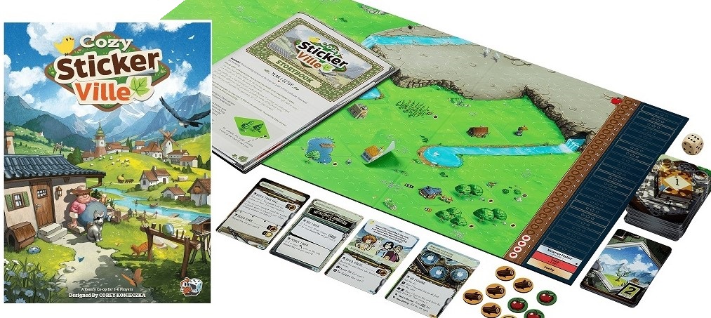 А, ещё предзаказал Cozy Stickerville – очередной эксперимент Кори Конички, но, судя по отзывам, наконец-то удачный. Семейный медитативный кооператив с историей про развитие деревеньки с помощью наклеек, коих в игре более 800. Кампания занимает 10 партий, и её можно пройти дважды. Будем пробовать с сыном.