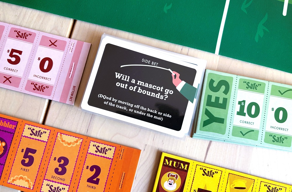 В общем после того, как все сделали ставки и добавили по 1 карточке, дилер хорошенько всё замешивает и со словами “На старт, внимание, марш!” срезает 3 случайные карты и начинает по одной вскрывать остальные, имитируя, так сказать, авто-забег. И тут начинается весёленькая дичь: маскоты давят друг друга, разворачиваются, бегут задом и даже ползут, и так до тех пор, пока не распределятся места (если колода закончилась, она снова перемешивается, и гонка продолжается). К слову, всё это действо выглядит довольно атмосферным, ведь, на минуточку, персонажи – это люди в огромных неуклюжих костюмах талисманов спортивных команд, которые обычно с трудом двигаются и адски потеют.