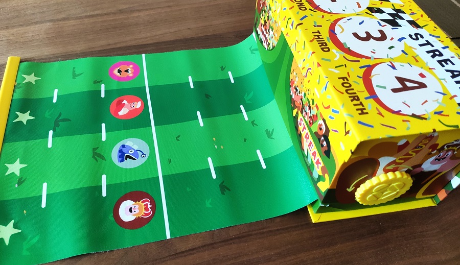 Несуразная коробка в виде кирпича прячет в себе отделение для фигурок, скручивающуюся трассу-коврик и небольшой лоток для прочих компонентов. Да, к стандартным коробкам на полке такое чудо трудно пристроить, но, в целом, оформление под стать несерьёзному процессу. Плюс, видно, что издатель подошёл, так сказать, с приколом и душой: двигать крупных раскрашенных маскотов удобно, сама коробка одновременно является и пьедесталом, коврик не из бумаги, а из специальной клеёнки, видимо, чтобы он не боялся напитков и крошек.