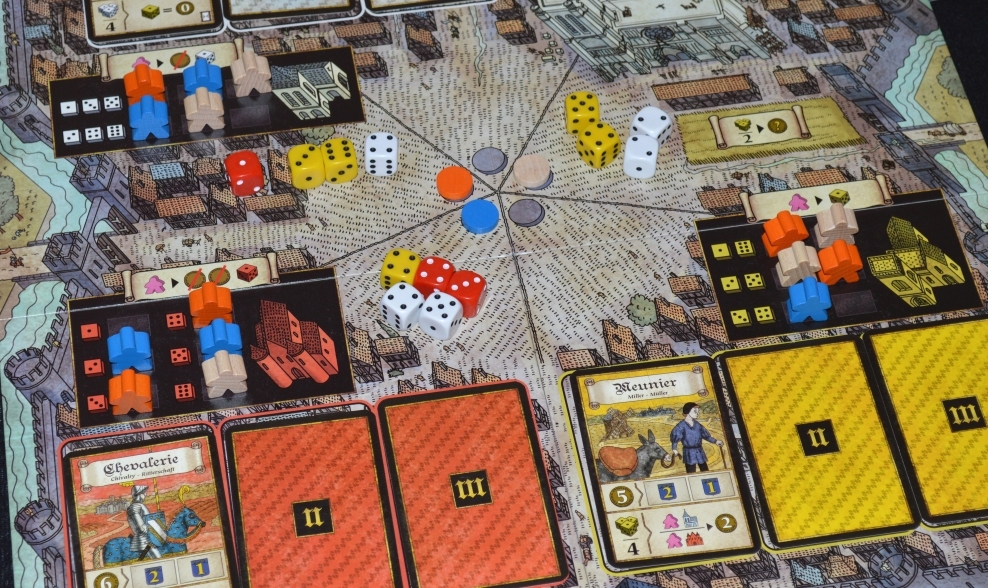Напоследок пару слов о Troyes. Обкатал-таки свою коробочку, полученную через math trade. Партия вышла какой-то сумбурной и мирной. Во-первых, никто практически не выкидывал чужих миплов со зданий, а во-вторых, все ленились бороться с внешней угрозой, из-за чего три раунда подряд приходилось кидать много плохих чёрных кубиков и применять ряд пакостных свойств.