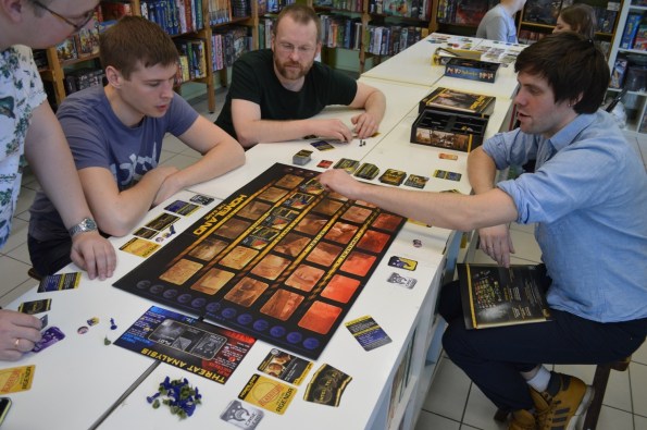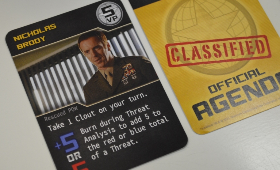 Homeland: The Game. Battlestar Galactica, из которой убрали почти всё, оставив только прохождение кризисов. Одноимённый сериал не смотрел, но, как мне кажется, с передачей темы тут туговато, – после партии понял лишь то, что сериал об агентах и террористах. Не помогли ни кадры из фильма, ни свойства персонажей, ни механики. Подпортило первое впечатление и скучное поле с сеткой под карты. В общем, игра довольно абстрактна.