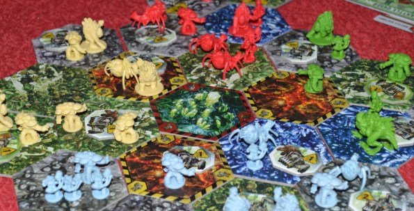 Кстати о правилах, недавно открыл для себя два момента, по которым играли неправильно, может, кому-нибудь пригодится. Первый: на руины только что открытых гексов кладётся по два бонусных жетончика (я думал, что, как на домашний, по одному, и только на центральный три). Второй: технология, которая позволяет тянуть кубик из мешка каждый раз, когда получаешь кристалл, работает только при генерации кристалла действием на планшете/карте (т.е. за убийство фигурки оппонента кубик не тянется).